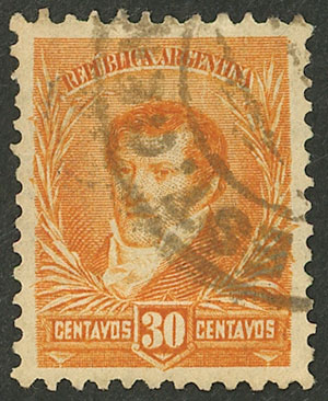 1896 30c. Belgrano with large sun watermark and COMPOUND PERFORATION 11½ x 12, used, rare! (Image)