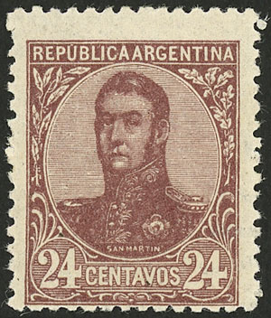 GJ.297a, 1908 24c. San Martín in oval, perforation 13½, WITHOUT WATERMARK variety, excellent quality and very rare! (Image)