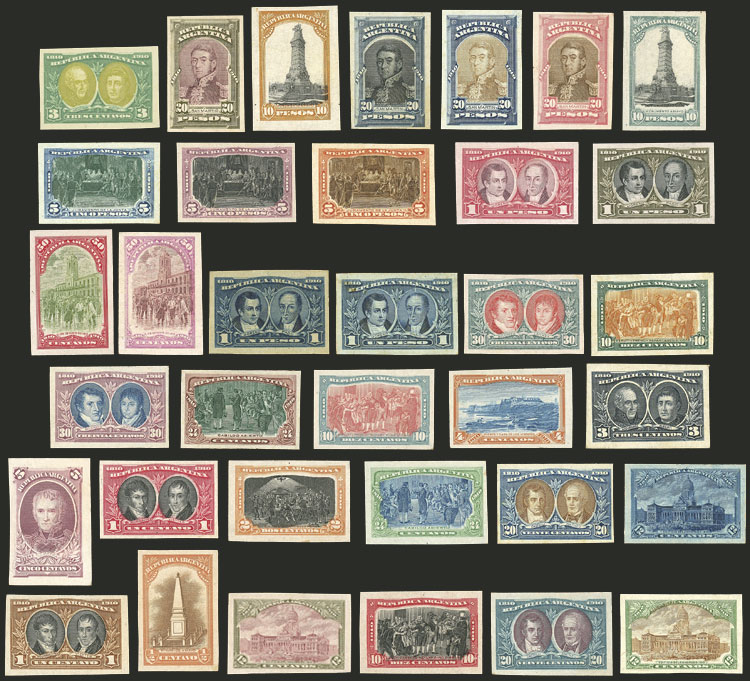 other values, 1910 Centenary of the May Revolution, 35 different COLOR PROOFS, one on thin paper and the rest printed on card, VF lot! (Image)