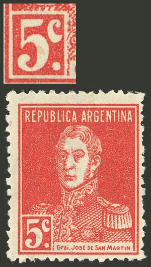 + 623b, 1926 Post Centenary 5c. San Martín with varieties: "double impression" + "double impression, one light and very shifted", VF quality! (Image)