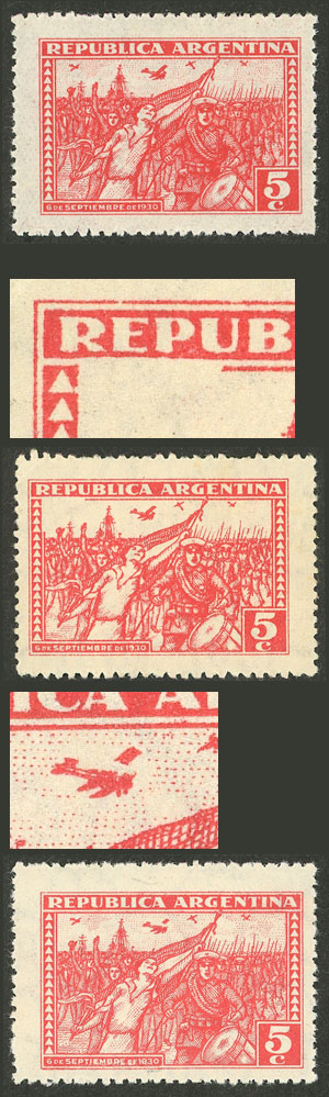 + 681d + 681e, 1930 5c. Revolution, 3 nice varieties: "Invisible watermark", "3 airplanes instead of 4", and "large airplane with broken wing", VF! (Image)