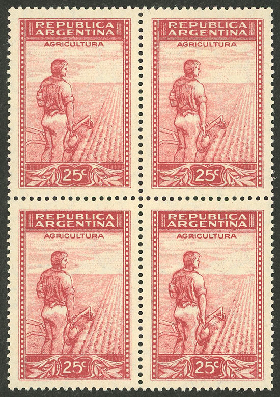 25c. Plowman in block of 4, the left stamps with variety "Sun without rays", these stamps with variety are MNH (+30%), VF quality! (Image)