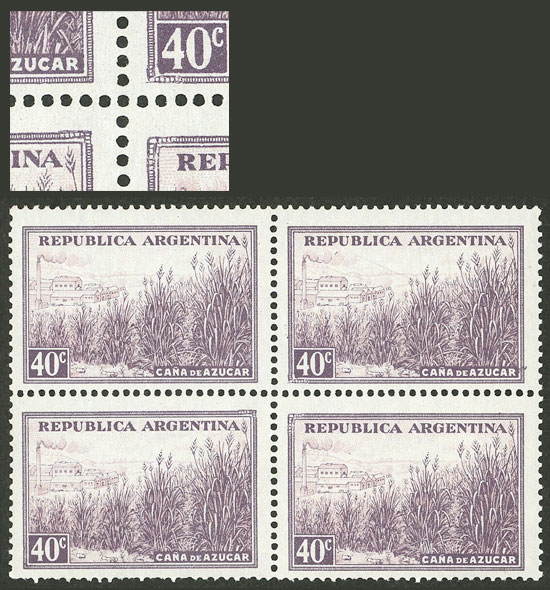 GJ.768Ac, 40c. Sugar cane, printed on thin chalky paper, block of 4 with 3 stamps with RETOUCHES in the central angles! (Image)