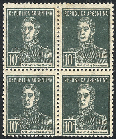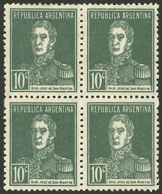 10c. San Martín, AP watermark, block of 4, unused and without gum, VF quality (Image)