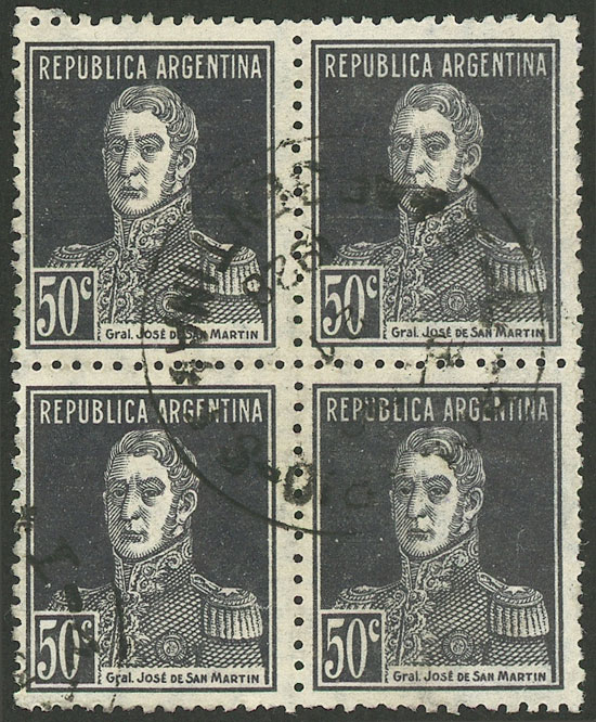 50c. San Martín, printed on ribbed paper, block of 4, used, VF, rare! (Image)