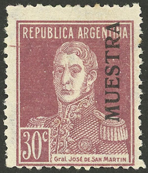 30c. San Martín, printed on ribbed paper, "MUESTRA" ovpt., with thin on back, nice front (Image)