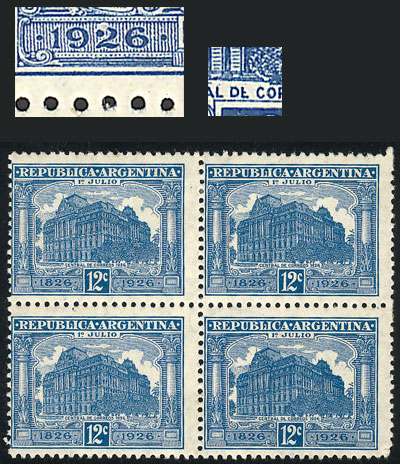 12c. Argentine Post centenary, block of 4, 2 stamps with varieties: 'E' in DE without top stroke and white spot over the '2' in '1926', VF quality (Image)