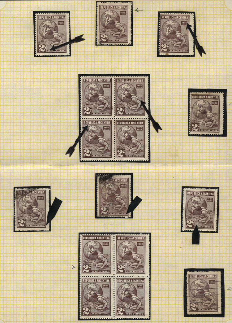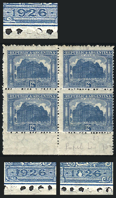 12c. Argentine Post centenary, marginal block of 4, 3 stamps with varieties: '9' and '2' in 1926 joint, '1' in 1926 defective, and white spot over the '8' in 1826, VF quality