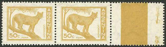 GJ.1125ACD, 50c. Puma, imported unsurfaced paper, pair with a right label WITH INSCRIPTIONS OF THE PRINTER (see right border of the label, rare!!), VF