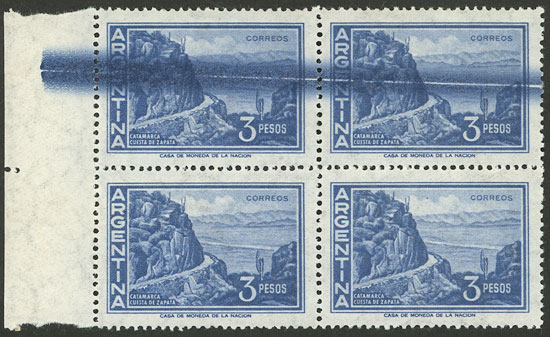 3P. Zapata slope, block of 4, with thick dark blue line across the top stamps, VF (Image)
