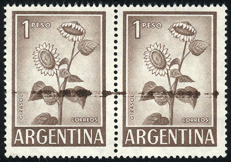 1P. Sunflower, imported unsurfaced paper, pair, with an irregular brown line across the stamps, VF quality (Image)