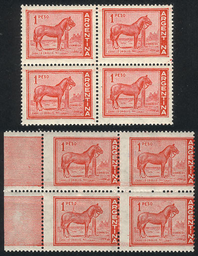 1P. Horse, very thick paper variety, block of 4, VF quality, along a normal block for comparison (Image)