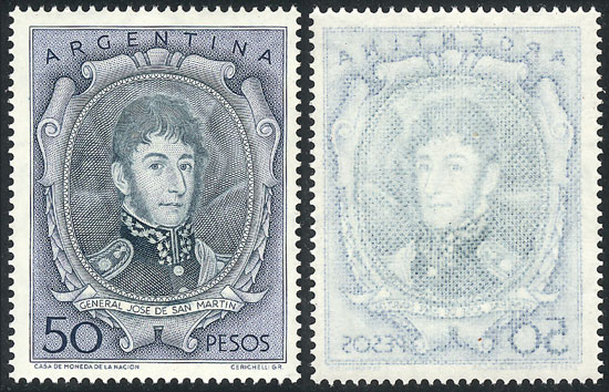50P. San Martín, light blue and green-blue, with offset impression on back var., VF quality (Image)