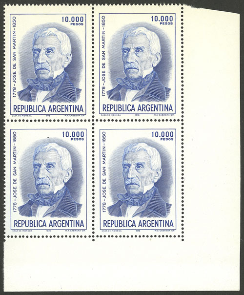 GJ.1853a, 10,000P. San Martín, FF chalky paper, in corner block of 4, VF (Image)