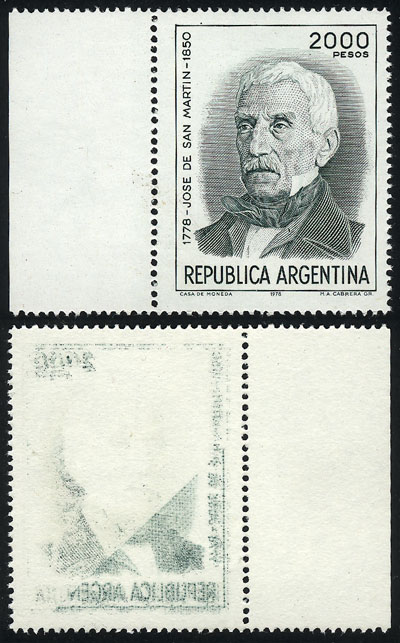 2000P. San Martín, unwatermarked, sheet margin, with partial offset impression on back, VF quality (Image)
