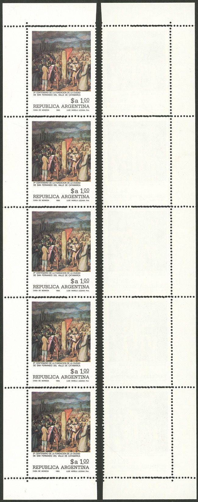 $a1.00 San Fernando del Valle de Catamarca, strip of 5 with double horiz perforation variety, VF (Image)