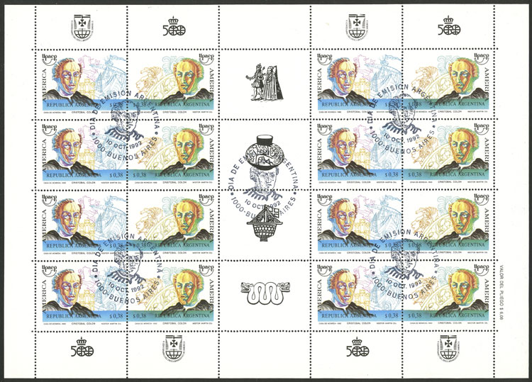 GJ.2617/8EN, Discovery of America 500 years, cmpl. sheet with 8 sets and gutters, first day postmark, VF (Image)