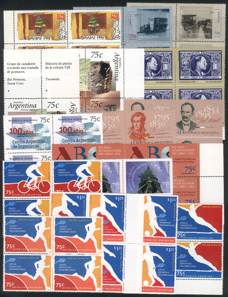 GJ.2696/702 + 2707 + 2710/1 + 2733/6 + 2738 + 2743 + 2754/5, commemorative stamps issued in 1995 (not including the stamps from the souvenir sheets), in blocks of 4, VF quality (Image)