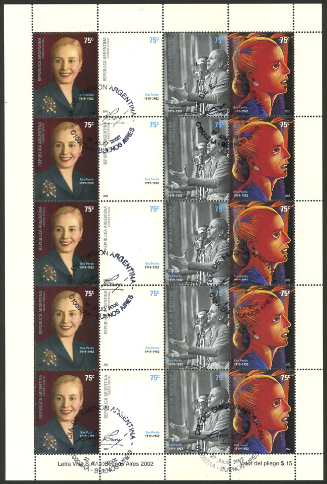 GJ.3220/3, Eva Perón 50th anniversary, cmpl. sheet with 5 sets, first day postmark, VF (Image)