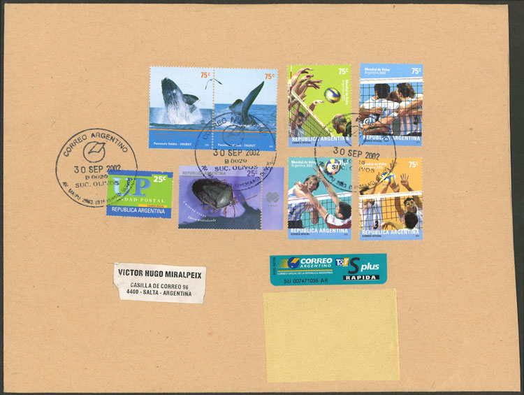GJ.3230/1 + 3236/9, Whales and Voleyball Championship, complete sets on cover sent from Olivos to Salta on 30/SE/2002, total postage $5, VF quality
