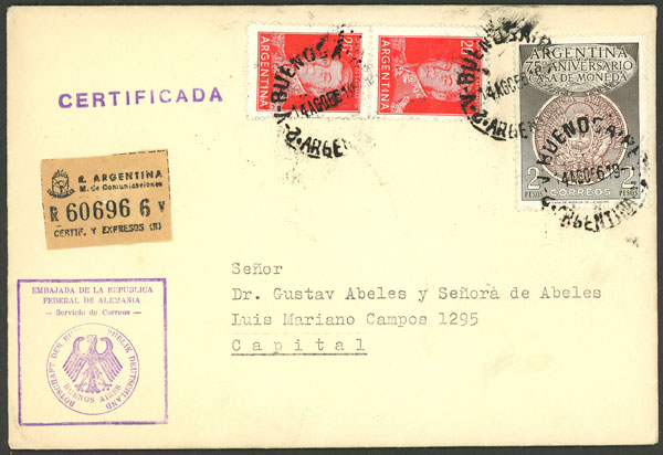 Registered cover used in Buenos Aires on 14/AU/1956, franked with 2x 20c. San Martín + $2 Mint, VF quality (Image)
