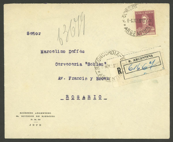 Registered cover sent from Concordia to Rosario on 8/NO/1935, franked with 30c. San Martin w/o period, VF (Image)