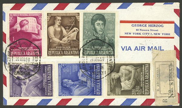 E.F.I.R.A. Stamp Exhibition, cmpl. set of 6 values (GJ.987/92) on registered cover sent from Buenos Aires to New York, with first day pmk, VF quality