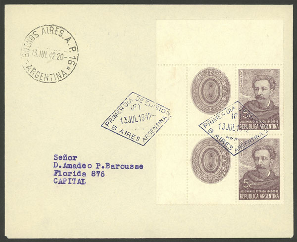 used in Buenos Aires on 13/JUL/1942, with pair 5c. Estrada with 2 labels at left, VF quality (Image)