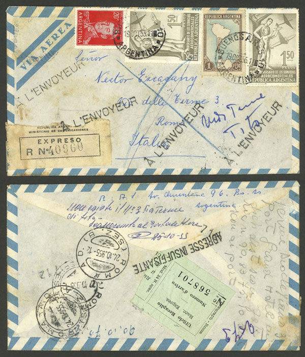 cover sent from Buenos Aires to Roma on 19/OC/1955, franked $4.20, returned to sender due to insufficient address, with several transit marks, VF quality (Image)