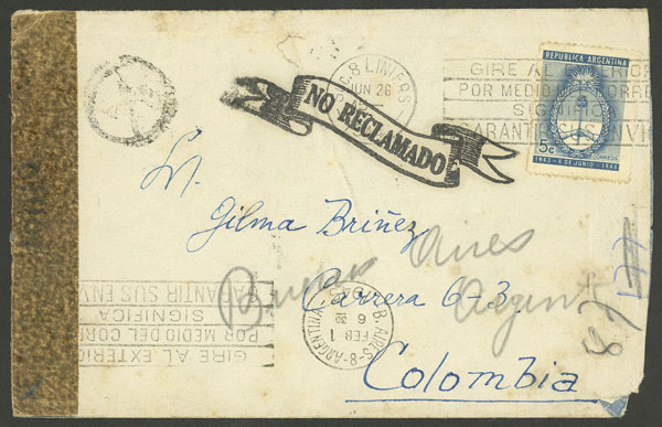 26/JUN/1944: Liniers - Colombia, cover franked with 5c. First Anniversary of 1943 Movement, with censor marks and Colombian "NO RECLAMADO" mark, VF quality