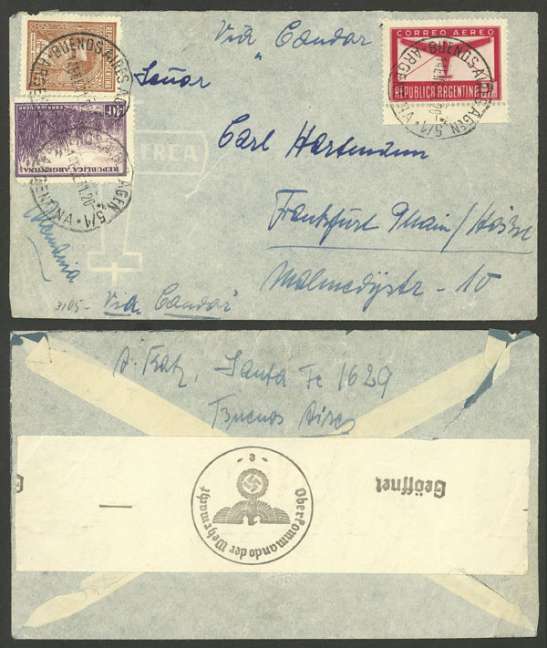 cover franked with $1.45, sent by Condor from Buenos Aires to Frankfurt on 14/JA/1941, with Nazi censor label, VF (Image)