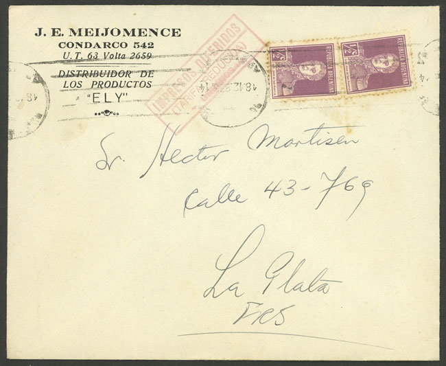 Cover sent to La Plata on 18/DE/1933, franked with 2x ½c. San Martín w/o period (reduced rate, Impreso Diferido), VF (Image) (Image-02)