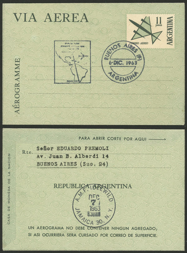 Aerogram carried from Buenos Aires to New York on FIRST FLIGHT by PANAM of 6/DE/1963, VF (Image)