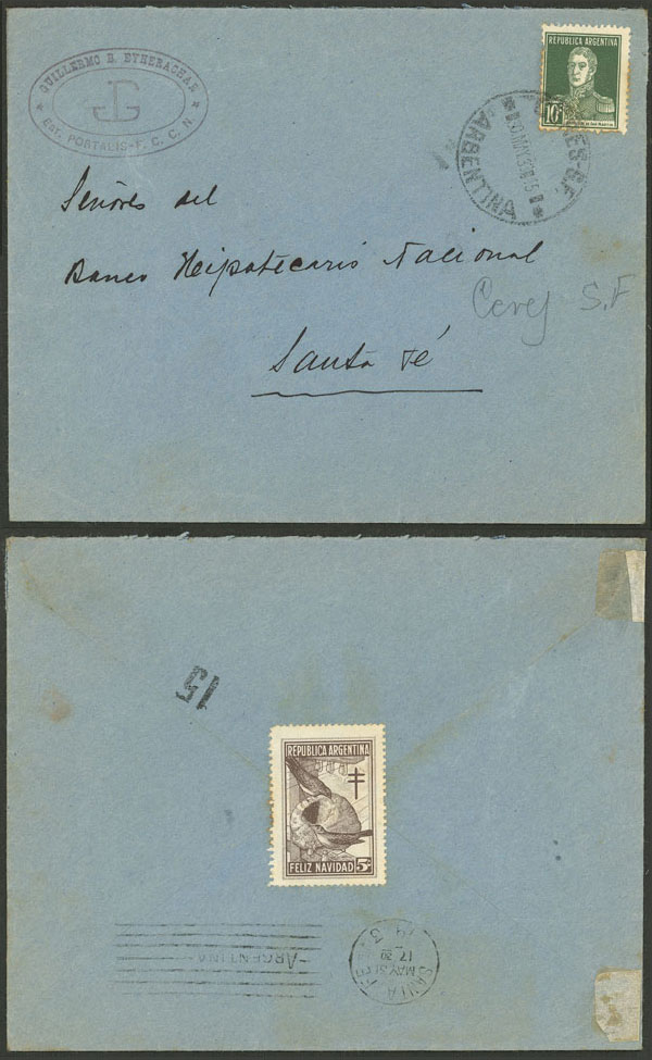 franked with 10c., sent to Santa Fe on 30/MAY/1933, with datestamp of CERES (Santa Fe), and cinderella on back, VF (Image)