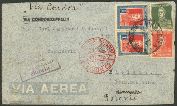 Airmail cover sent from B.Aires to Poland on Zeppelin's 6th yearly flight, franked with $2.15, with Friedrichshafen mark and other transit marks, VF (Image)