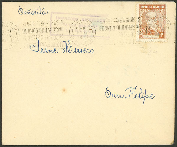 sent from Tucumán to San Felipe (Tucumán) in 1943, franked with 1c. Sarmiento, typographed, chalky, VF (Image)