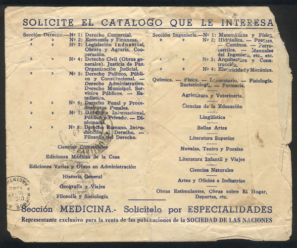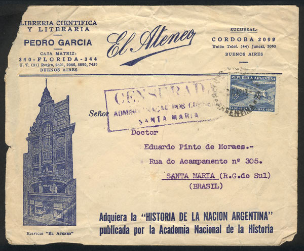 Cover with advertising for bookstore, sent from Buenos Aires to Santa Maria (Brazil) in DE/1948, franked with 15c. Columbus Lighthouse, with Brazilian CENSOR mark (Image) (Image-02)