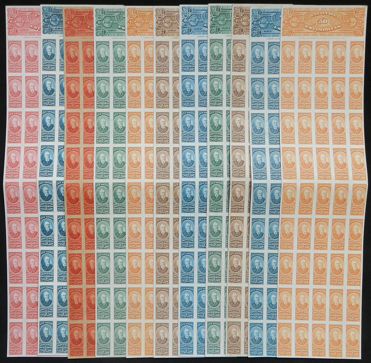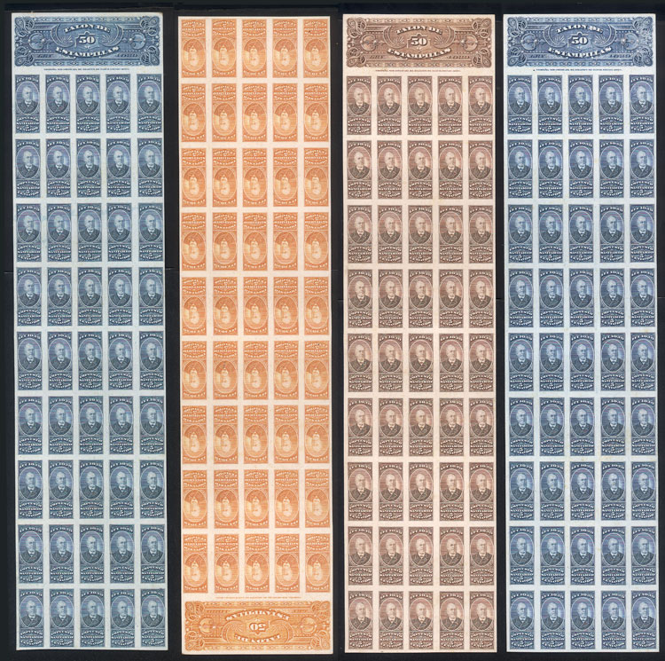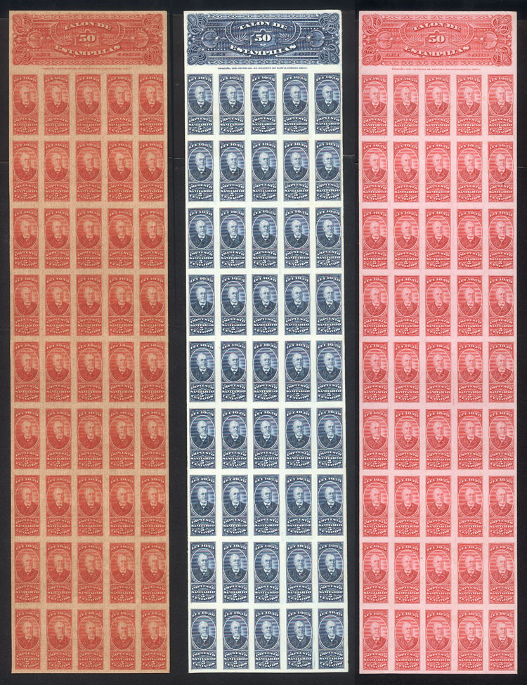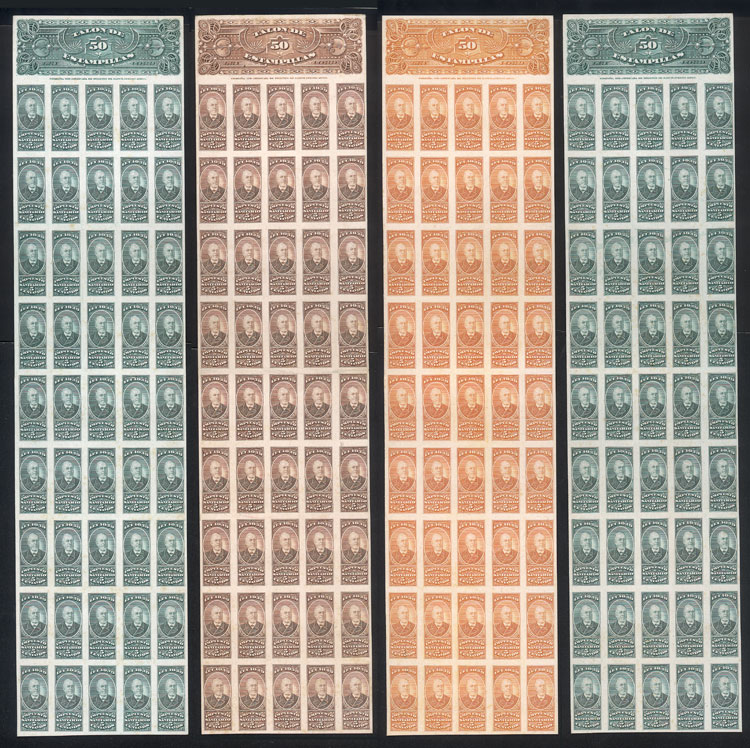 1012   image5c. Health tax, Ley 4039, blocks of 50 revenue stamps, 11 proofs in different colors printed on card (some opaque, most with glazed front, and one on thick paper with glazed front), VF quality, very rare group! (Image) (Image-02) (Image-03) (Image-04) (All Images)