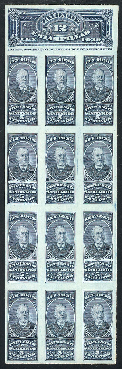 1011   image5c. Health tax, Ley 4039, block of 12 revenue stamps, proof in blue color printed on thick paper with glazed front, VF quality, rare! (Image)