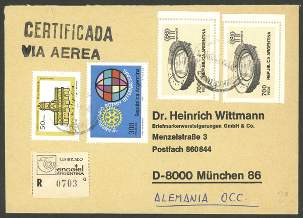 1002   imageRegistered cover sent from Buenos Aires to Germany in 1979, franked with $50 Buenos Aires City Hall + $300 Rotary 75 years + 2x $700 Argentina '78 (total $1750), VF quality (Image)