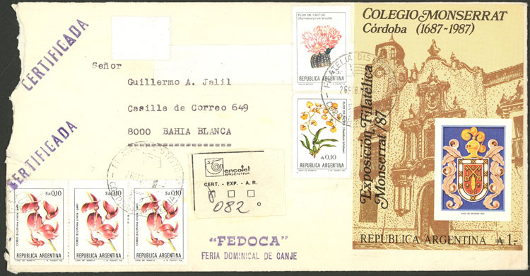 1005   imagePOSTAGE WITH STAMPS IN DIFFERENT CURRENCIES: Registered cover sent from Buenos Aires to Bahia Blanca (circa 1987) with MIXED POSTAGE of $a0.30 and A6.10 (stamps and souvenir sheet respectively) (Image)