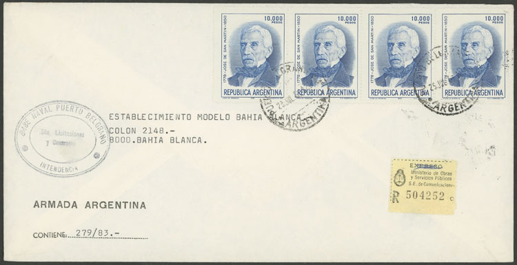 1004   imageCover sent from Base Puerto Belgrano to Bahía Blanca on 23/JUL/1983, franked with $40,000 (4x GJ.1853), VF (Image)