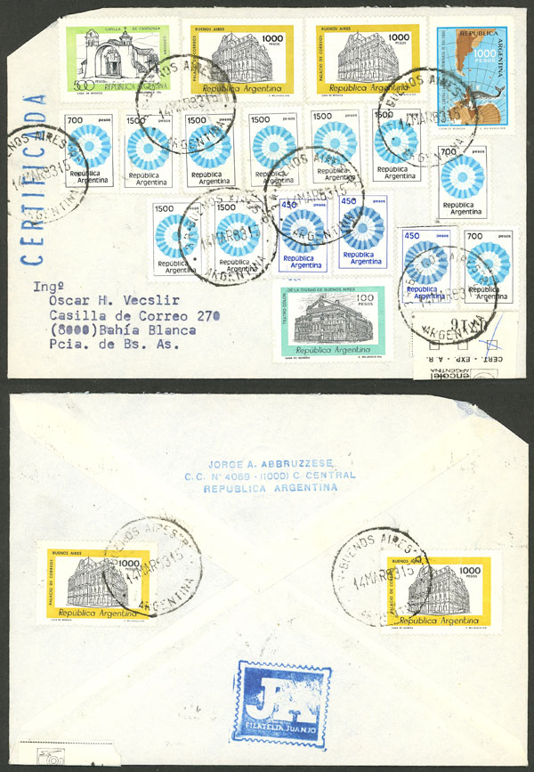 1003   imageRegistered cover sent from B.Aires to Bahia Blanca on 14/MAR/1983, with INFLA POSTAGE of $20,000, with 20 varied stamps, VF (Image)