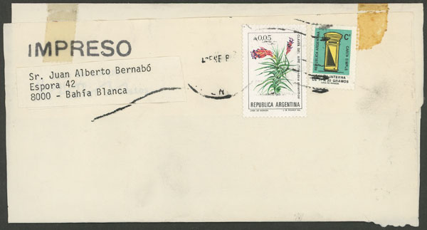 1006   imageWrapper sent to Bahía Blanca (circa. 1988), combining stamps of C' (GJ.2345) and A0.05 (Clavel del Aire, GJ.2212), with adhesive tape marks (Image)