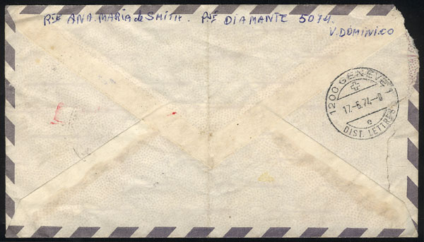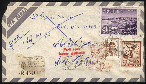 1001   imageRegistered cover sent from Buenos Aires to Switzerland on 11/JUN/1974, returned to sender, franked with $301.10, postage formed with $300 Mar del Plata (GJ.1149B), $1 Bariloche (GJ.1535) and 10c. Belgrano (GJ.1528) (Image) (Image-02) (All Images)