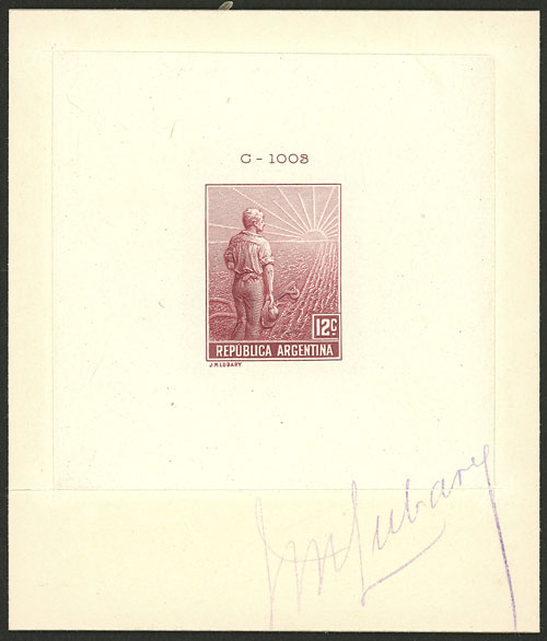 1911 12c. Plowman, DIE PROOF in purple-carmine (not catalogued by Kneitschel), printed on thin paper affixed to card, with signature of the artist (J.M.Lubary), excellent quality, rare! (Image)