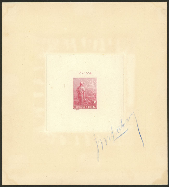 1911 12c. Plowman, DIE PROOF in red, printed on thin paper affixed to thin card, with signature of the artist (J.M.Lubary), excellent quality, rare! (Image)