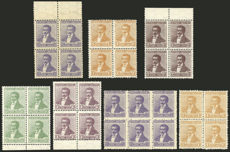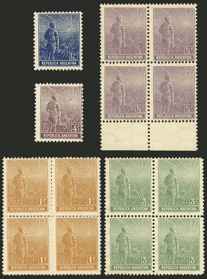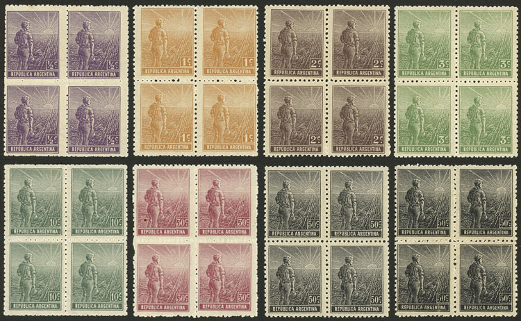 GJ.319/326 (without 323, unissued), 1911 Plowman with sun with wavy rays watermark, complete set of 7 values in blocks of 4 + the 50c. in a different shade, almost all MNH, very fine quality! (Image)