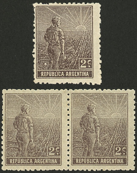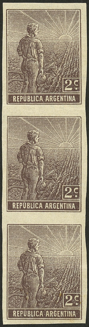 1911 2c. Plowman IMPERFORATE, vertical strip of 3, MNH (+50%), VF quality, very rare! (Image)