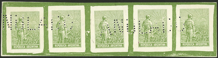 1911 5c. Plowman, proof typographed by Casa de Moneda de Buenos Aires, strip of 5 printed with colored background on paper, in LIGHT GREEN, superb, very rare. Punched "ANULADO", ex-Kneitschel (Image)
